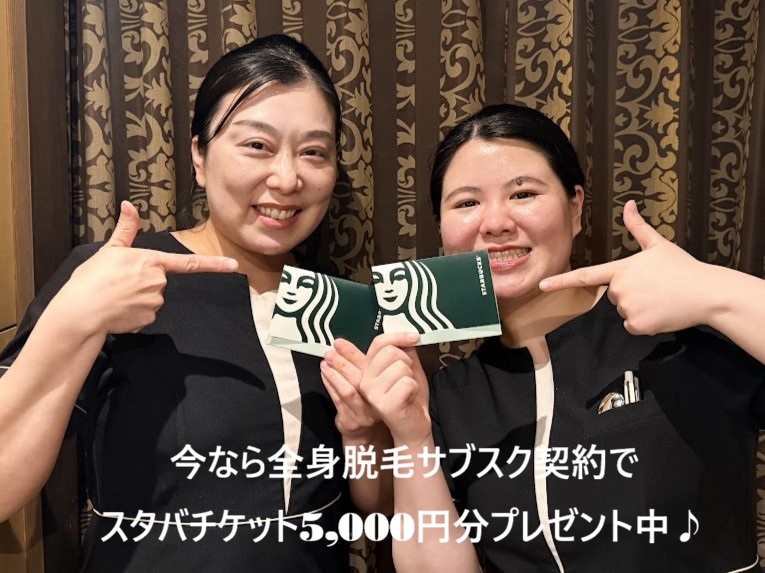 賢く通えるサブスクなら、お財布にも優しくツルピカ肌へ。今月だけのスペシャル特典として全身脱毛ご契約の方へに、自分へのご褒美に嬉しい「スタバチケット5,000円分」を差し上げます。コーヒーを飲みながら、夏のお出かけ計画を立てませんか?