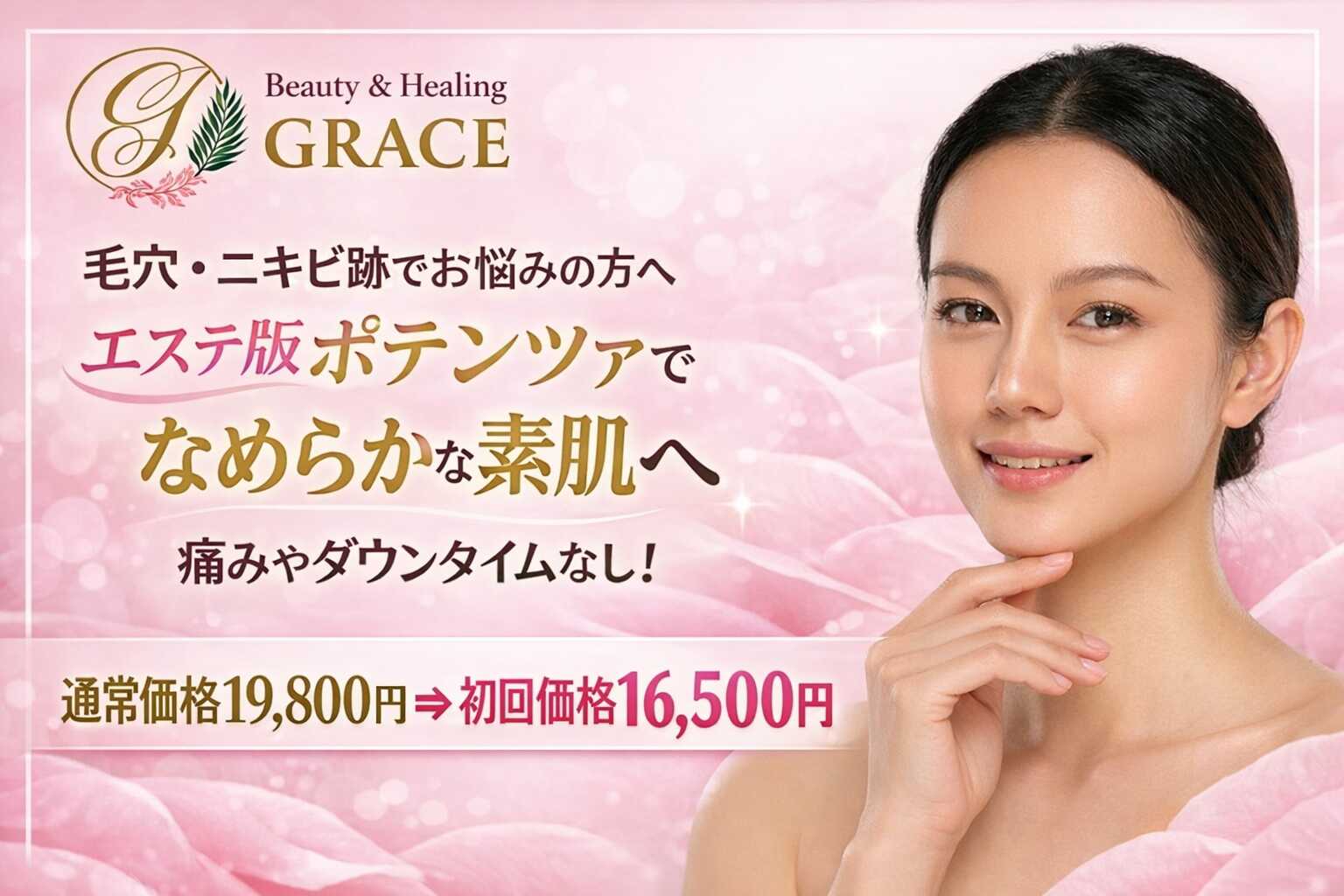 グレースでは、お一人おひとりの肌悩みに合わせて、無理のないご提案を心がけています。毛穴やニキビ跡にお悩みの方は、ぜひ一度エステ版ポテンツァをご体感ください。なめらかで触れたくなるような肌を目指したい方におすすめです。