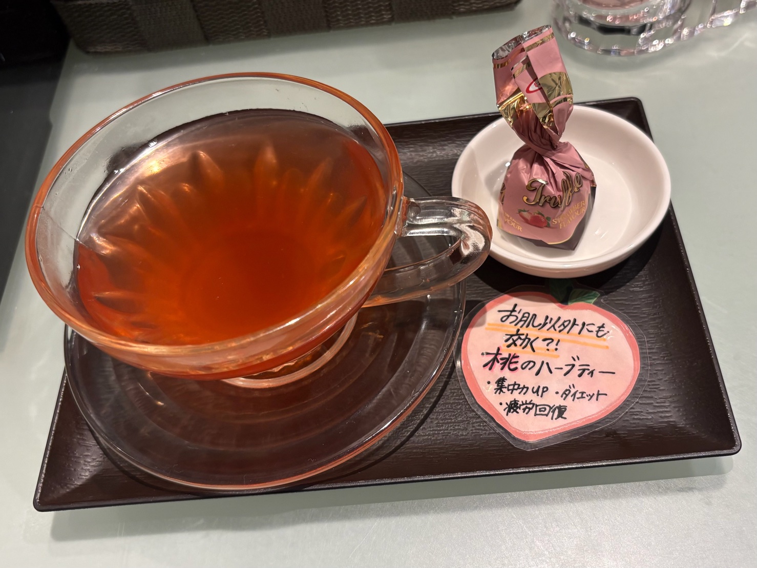 季節によって種類も変えています♪ちなみに今月は桃のハーブティです。吉岡さんて手作りのポップにはプチ美容情報も♡
